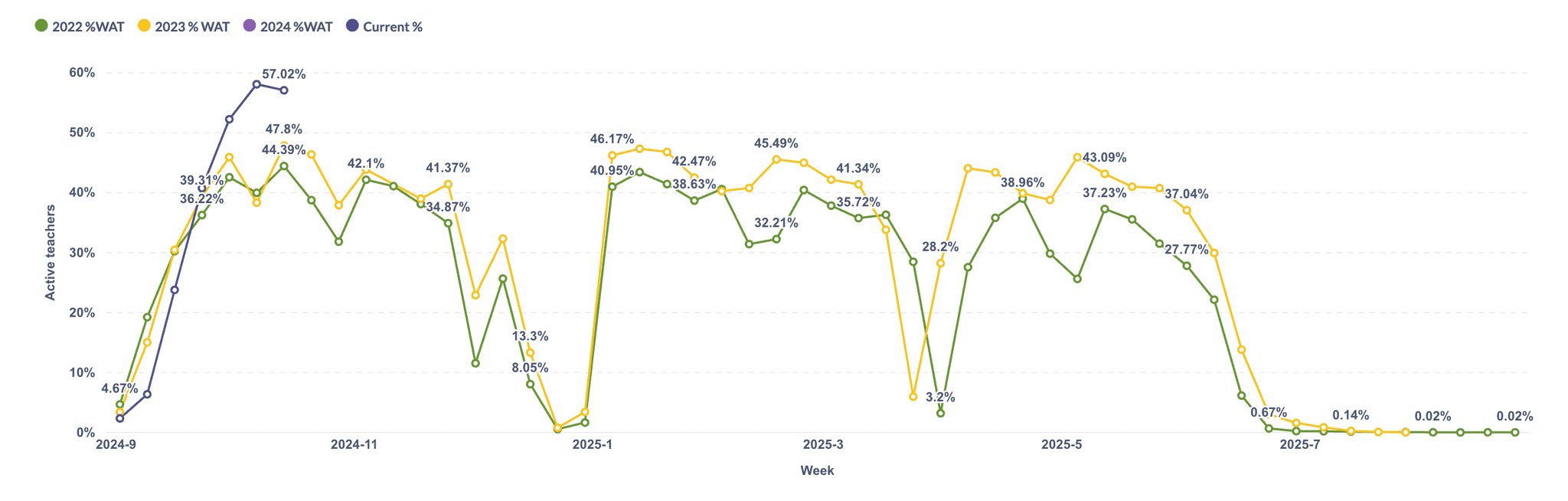 Weekly active teachers in comparison to last academic year.