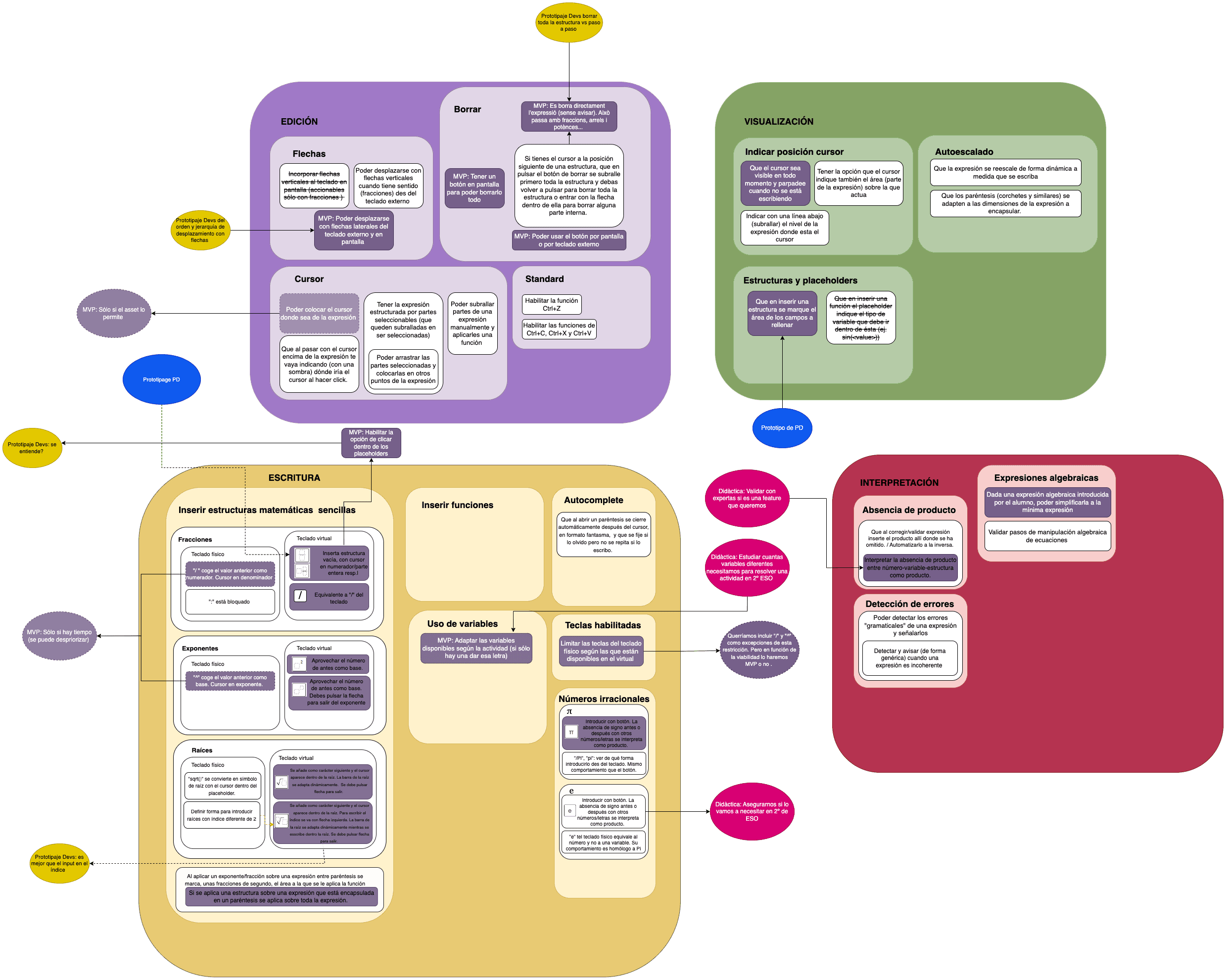 This diagram contains the features, specified to concrete mechanics, that we want to implement for the MVP (the gray ones) and includes future features that are related to them so we can work aknowledging what are the future steps like. We’ve marked those tasks that we should validate (through prototypes or asking didactical experts) before taking final decisions on some mechanics.
