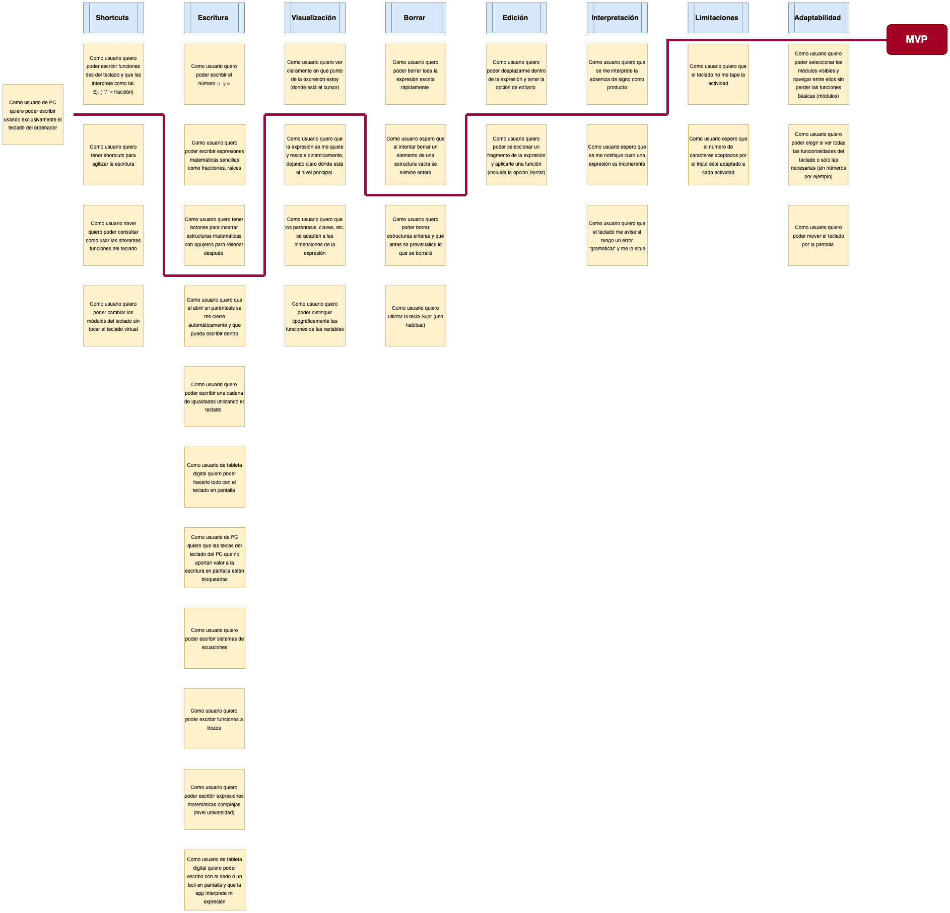 We grouped the different user stories appeared during the brainstorming and selected those we want to achieve for the MVP. In the future we’ll select the features we want to add for later versions of the product.